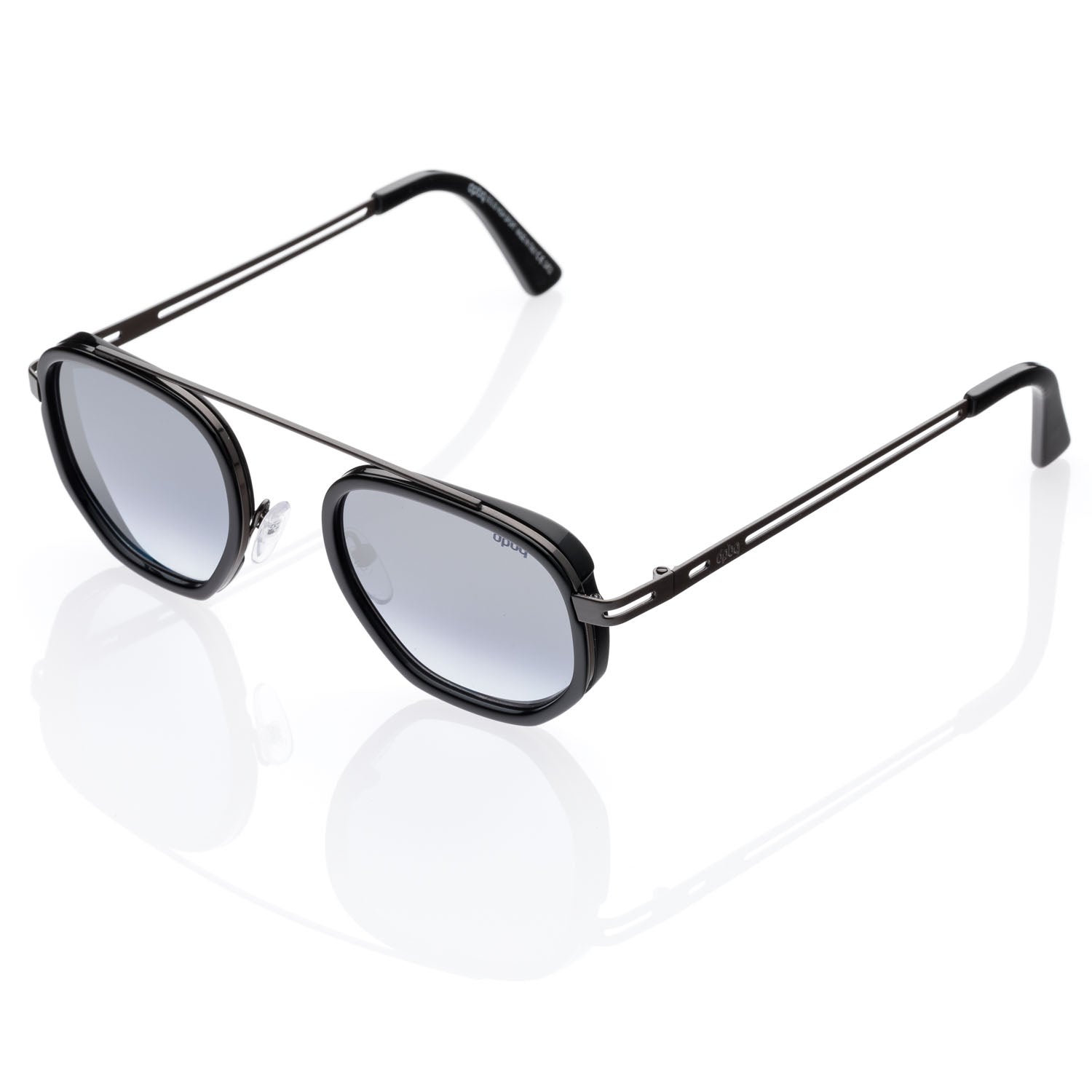 Forma redonda de metal gris plomo con puntas y círculos de acetato y lentes grises espejadas degradadas negras categoría de protección 2